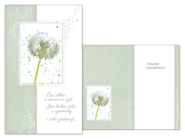 Úmrtí blízké osoby je vždy tragická událost. Vyjádřete kondolencí upřímnou soustrast a soucit pozůstalým. Kondolenční přání a smuteční květiny Vám zajistí důstojné rozloučení s vaším blízkým člověkem. Text na přední straně přání: Čas ubíhá a nevrací co vzal Jen láska, úcta a vzpomínky v srdci zůstávají. Text uvnitř přání: Smutně vzpomínáme Papír: pohlednicový karton 240 g Přání je baleno v sáčku, součástí balení je i dopisní obálka