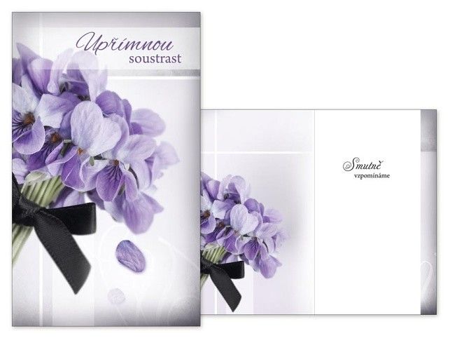 Úmrtí blízké osoby je vždy tragická událost. Vyjádřete kondolencí upřímnou soustrast a soucit pozůstalým. Kondolenční přání a smuteční květiny Vám zajistí důstojné rozloučení s vaším blízkým člověkem. Přání je s obrázkem fialek obvázaných černou stužkou. Text na přední straně přání: Upřímnou soustrast Text uvnitř přání: Smutně vzpomínáme Papír: pohlednicový karton 240 g Přání je baleno v sáčku, součástí balení je i dopisní obálka.