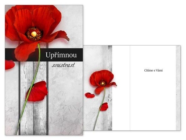 Úmrtí blízké osoby je vždy tragická událost. Vyjádřete kondolencí upřímnou soustrast a soucit pozůstalým. Kondolenční přání a smuteční květiny Vám zajistí důstojné rozloučení s vaším blízkým člověkem. Přání je s obrázkem vlčího máku. Text na přední straně přání: Upřímnou soustrast Text uvnitř přání: Cítíme s Vámi Papír: pohlednicový karton 240 g Přání je baleno v sáčku, součástí balení je i dopisní obálka.