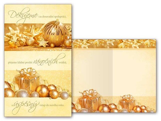 Novoroční přání neboli PF. Nezapomeňte popřát známým do nového roku. Zajisté je potěší, že jste si na ně vzpomněli. Text na přední straně přání: Děkujeme za dosavadní spolupráce, přejeme klidné prožití vánočních svátků a úspěšný vstup do nového roku. Text uvnitř přání: Bez textu. Papír: pohlednicový karton 240 g Přání je baleno v sáčku, součástí balení je i dopisní obálka.