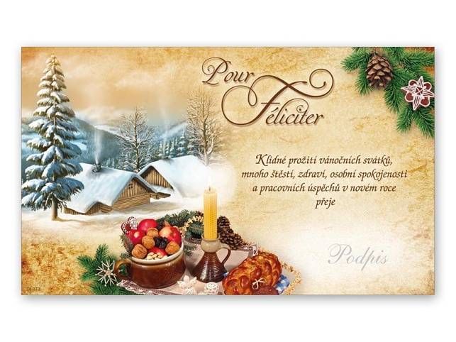 Novoroční přání neboli PF. Nezapomeňte popřát známým do nového roku. Zajisté je potěší, že jste si na ně vzpomněli. Text na přední straně přání: Pour Féliciter Klidné prožití vánočních svátků, mnoho štěstí, zdraví, osobní spokojenosti a pracovních úspěchů v novém roce přeje Text uvnitř přání: Bez vnitřního textu. Papír: pohlednicový karton 240 g Přání je baleno v sáčku, součástí balení je i dopisní obálka.