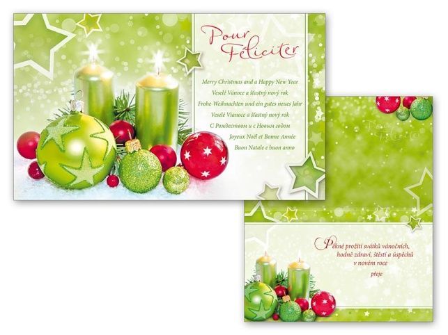 Novoroční přání s textem, neboli PF. Nezapomeňte popřát známým do nového roku. Zajisté je potěší, že jste si na ně vzpomněli. Text na přední straně přání: Pour Féliciter Merry Christmas and Happy New Year. Veselé Vánoce a šťastný nový rok. Frohe Weihnachten und ein gutes neues Jahr Veselé Vianoce a šťastný nový rok Joyeux Noel et Bonne Année Buon Natale e buon anno Text uvnitř přání: Pěkné prožití svátků vánočních, hodně zdraví, štěstí a úspěchů v novém roce přeje Papír: pohlednicový karton 240 g Přání je baleno v sáčku, součástí balení je i dopisní obálka.