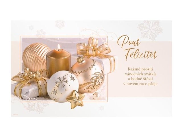 Novoroční přání neboli PF. Nezapomeňte popřát přátelům, kolegům nebo rodině do nového roku. Zajisté je potěší, že jste si na ně vzpomněli. Text na přední straně přání: Pour Féliciter Příjemné prožití vánočních svátku a hodně šestí v novém roce přeje Text uvnitř přání: Bez textu Papír: pohlednicový karton Přání je baleno v sáčku, součástí je i dopisní obálka. Uvedená cena je za 1 ks.