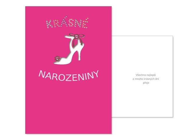 Srdečné přání k narozeninám. Text na přední straně přání: Krásné narozeniny Text uvnitř přání: Všechno nejlepší a mnoho krásných dní přeje Papír: pohlednicový karton 240 g Přání je baleno v sáčku, součástí balení je i dopisní obálka Přání je na obale označené doporučenou prodejní cenou.