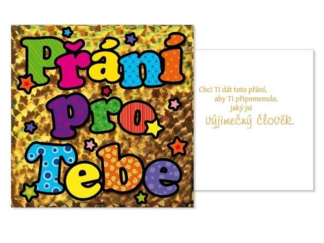 Srdečné přání s textem. Text na přední straně přání: Přání pro tebe Text uvnitř přání: Chci Ti dát toto přání aby Ti připomenulo, jaký jsi Vyjímečný člověk. Papír: pohlednicový karton 240 g Přání je baleno v sáčku, součástí balení je i dopisní obálka Přání je na obale označené doporučenou prodejní cenou.