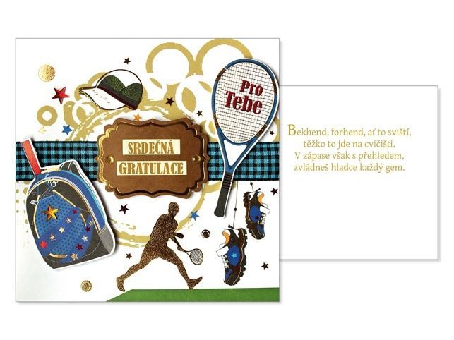Srdečné přání k narozeninám, svátku nebo jiné příležitosti. Přání pro tenisty a fanoušky tenisu. Text na přední straně přání: Srdečná gratulace pro tebe Text uvnitř přání: Bekhend, forhend, ať to sviští, těžko to jde na cvičišti. V zápase však s přehledem, zvládneš hladce každý gem. Papír: pohlednicový karton 240 g Přání je baleno v sáčku, součástí balení je i dopisní obálka Přání je na obale označené doporučenou prodejní cenou.