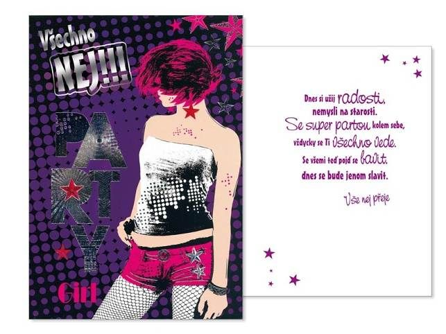 Srdečné blahopřání k narozeninám s textem. Text na přední straně přání: Všechno nej Text uvnitř přání: Dnes si užij radosti, nemysli na starosti. Se super partou kolem sebe, vždycky se Ti všechno vede. Se všemi teď pojď se bavit, dnes se bude jenom slavit. Vše nej přeje Papír: pohlednicový karton 240 g Přání je baleno v sáčku, součástí balení je i dopisní obálka Přání je na obale označené doporučenou prodejní cenou.
