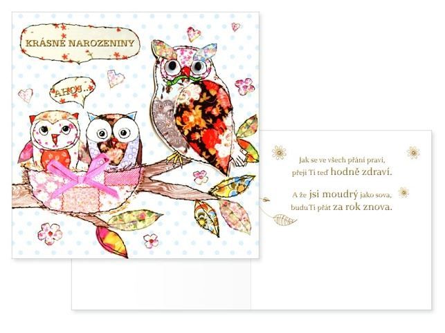 Srdečné přání k narozeninám s textem. Aby vše bylo dokonalé nezapoměňte k dárku koupit i přání. Text na přední straně přání: Krásné narozeniny Text uvnitř přání: Jak se ve všech přání praví, přeji Ti teďhodně zdraví. A že jsi moudrý jako sova, budu Ti přát za rok znova. Papír: pohlednicový karton 300 g Přání je baleno v sáčku, součástí balení je i dopisní obálka Přání je na obale označené doporučenou prodejní cenou.