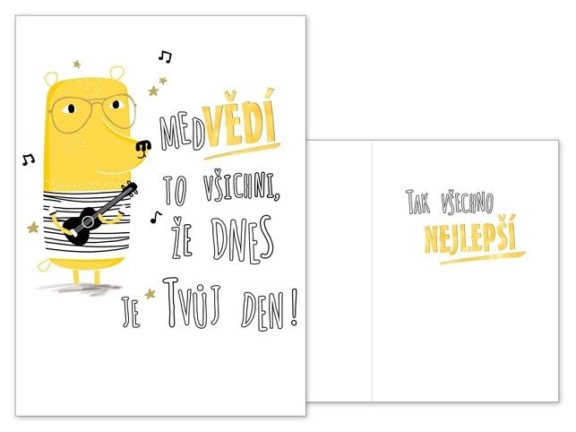 Srdečné přání k narozeninám nebo svátku s textem. Aby vše bylo dokonalé nezapoměňte k dárku koupit i přání. Text na přední straně přání: MedVĚDÍ to včichni, že dnes je Tvůj den! Text uvnitř přání: Tak všechno nejlepší Papír: pohlednicový karton 240 g Přání je baleno v sáčku, součástí balení je i dopisní obálka Přání je na obale označené doporučenou prodejní cenou.