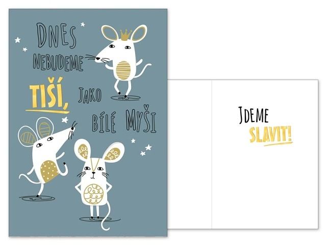 Srdečné přání k narozeninám nebo svátku s textem. Aby vše bylo dokonalé nezapoměňte k dárku koupit i přání. Text na přední straně přání: Dnes nebudeme tiší, jako bílé myši. Text uvnitř přání: Jdeme slavit Papír: pohlednicový karton 240 g Přání je baleno v sáčku, součástí balení je i dopisní obálka Přání je na obale označené doporučenou prodejní cenou.