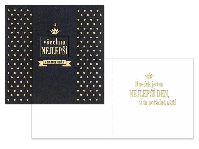 Srdečné přání k narozeninám - Potěšte oslavence a věnujte mu srdečné přání k narozeninám! Text na přední straně: Všechno nejlepší k narozeninám Text uvnit přání: Dnešek je ten nejlepší den, si to pořádně užít! Nápis je ražený zlatou folií, součástí přání je obálka. Přání je na obale označené doporučenou prodejní cenou.
