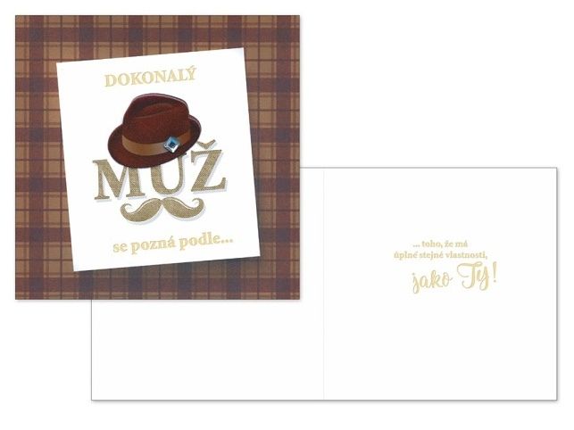 Srdečné přání k narozeninám - Potěšte oslavence a věnujte mu srdečné přání k narozeninám! Text na přední straně: Dokonalý muž se pozná podle... Text uvnit přání: … toho, že má úplně stejné vlastnosti jako Ty! Nápis je ražený zlatou folií, součástí přání je obálka. Přání je na obale označené doporučenou prodejní cenou.
