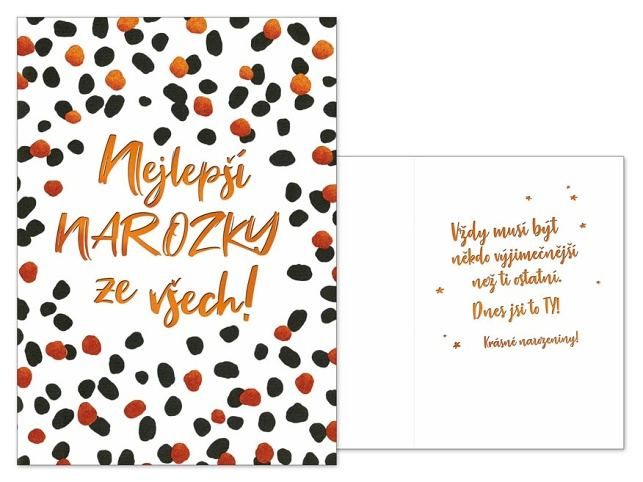 Srdečné přání k narozeninám - Potěšte oslavence a věnujte mu srdečné přání k narozeninám! Text na přední straně: Nejlepší narozky ze všech! Text uvnit přání: Vždy musí být někdo výjimečnější než ti ostatní. Dnes jsi to TY! Krásné narozeniny! Nápis je raženýoranžovou folií, součástí přání je obálka. Přání je na obale označené doporučenou prodejní cenou.