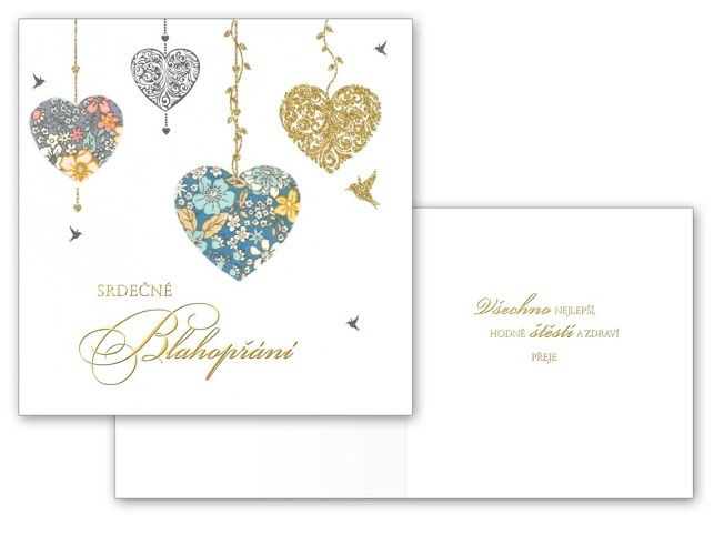 Udělejte oslavenci radost originálním narozeninovým přáním. Text na přední straně přání: Srdečné Blahopřnání Text uvnitř přání: Všechno nejlepší, hodně štěstí a zdraví přeje Papír: pohlednicový karton 240 g Přání je baleno v sáčku, součástí balení je i dopisní obálka.