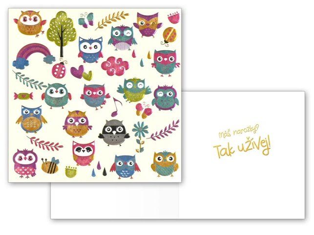 Udělejte oslavenci radost originálním narozeninovým přáním. Text uvnitř přání: Máš narozky? Tak užívej! Papír: pohlednicový karton 240 g Přání je baleno v sáčku, součástí balení je i dopisní obálka.