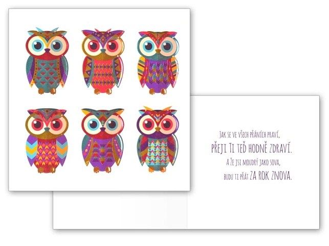 Udělejte oslavenci radost originálním narozeninovým přáním. Text uvnitř přání: Jak se ve všech přáních praví, přeji Ti teď hodně zdraví. A že jsi moudrý jako sova, budu ti přát za rok znova. Přání je baleno v sáčku, součástí balení je i dopisní obálka. Přání je na obale označené doporučenou prodejní cenou.