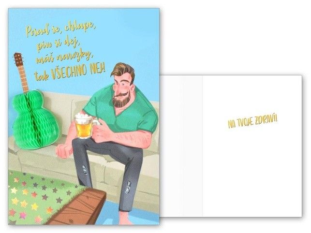 Udělejte oslavenci radost originálním narozeninovým přáním. Text na přední straně přání: Posaď se chlape, pivo si dej, máš narozky, tak VŠECHNO NEJ! Text uvnitř přání: Na tvoje zdraví! Přání je baleno v sáčku, součástí balení je i dopisní obálka.