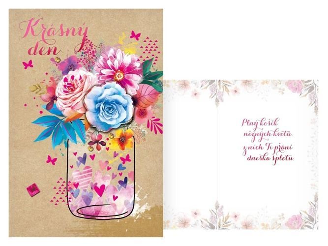 Udělejte oslavenci radost originálním narozeninovým přáním. Text na přední straně přání: Krásný den Text uvnitř přání: Plný košík něžných květů, z nich Ti přání dneska spletu. Přání je baleno v sáčku, součástí balení je i dopisní obálka.