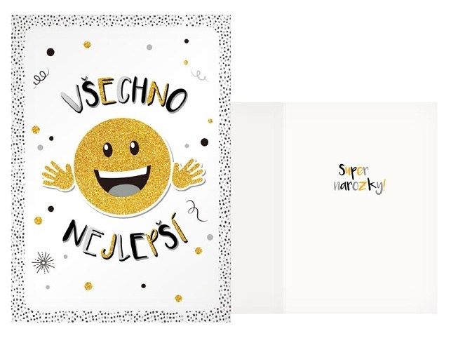 Přání srdečné - Krásné srdečné přání k narozeninám se smajlíkem. Udělá oslavenci určitě velikou radost a bude mu tohle krásné přání připomínat tuhle radostnou událost. Text na přední straně přání: Všechno nejlepší Text uvnitř přání: Super narozky! Papír: pohlednicový karton 240g Přání je baleno v sáčku, součástí balení je i dopisní obálka.