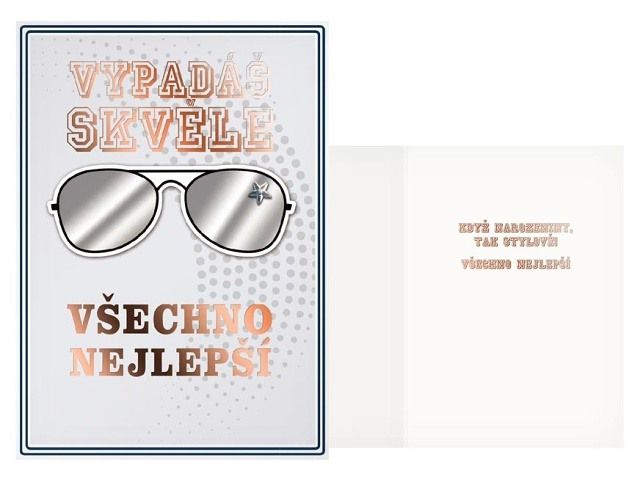 Přání srdečné - Krásné srdečné přání k narozeninám. Udělá oslavenci určitě velikou radost a bude mu tohle krásné přání připomínat tuhle radostnou událost. Text na přední straně přání: Vypadáš skvěle Všechno nejlepší Text uvnitř přání: Když narozeniny, tak stylově Všechno nejlepší Papír: pohlednicový karton 240g Přání je baleno v sáčku, součástí balení je i dopisní obálka.