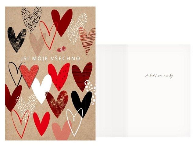 Přání srdečné - Krásné srdečné přání se srdíčkem. Udělá všem ženám určitě velikou radost. Text na přední straně přání: Jsi moje všechno Text uvnitř přání: A budeš tím navěky Papír: pohlednicový karton 240g Přání je baleno v sáčku, součástí balení je i dopisní obálka.