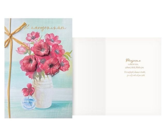 Srdečné přání k narozeninám s motivem červených květů v rustikální váze je ideálním způsobem, jak oslavenci popřát vše nejlepší k jeho významnému dni. Je to skvělý způsob, jak ho potěšit a vytvořit pro něj krásnou vzpomínku na jeho narozeninový den. Text na přední straně přání: K narozeninám Text uvnitř přání: Přejeme v dnešní den, zdraví, štěstí, blahojen. Vše nejlepší, slunce v tváři, po celý rok ať jen září. Papír: pohlednicový karton 240 g Přání je baleno v sáčku. Součástí přání je i obálka. Uvedená cena je za 1 ks.