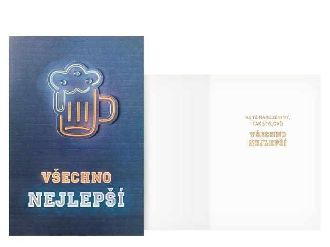 Stylové přání pro pořádnou oslavu! přání v sobě spojuje jednoduchost, nadhled a špetku humoru. Ideální pro všechny, kteří mají rádi přání s charakterem a ocení trochu oslavné hravosti. Připijte na zdraví oslavence s tímto originálním kouskem! Text na přední straně přání: Všechno nejlepší Text uvnitř přání: Když narozeniny, tak stylově! Všechno nejlepší Papír: pohlednicový karton 240 g Přání je baleno v sáčku, součástí balení je i dopisní obálka. Uvedená cena je za 1 ks.