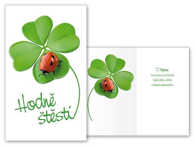 Srdečné přání k narozeninám, svátku nebo jiné příležitosti se čtyřlístkem a beruškou. Text na přední straně přání: Hodně štěstí Text uvnitř přání: Přejeme, co za peníze není mání, hodně štěstí, zdraví a hlavně splněná Přání.. Papír: pohlednicový karton 240 g Přání je baleno v sáčku, součástí balení je i dopisní obálka