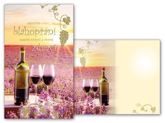 Srdečné přání k narozeninám, svátku nebo jiné příležitosti - s obrázkem vína - pro milovníky vín Text na přední straně přání: Srdečné blahopřání, hodně štěstí a pevné zdraví Text uvnitř přání: Bez textu. Papír: pohlednicový karton 240 g Přání je baleno v sáčku, součástí balení je i dopisní obálka