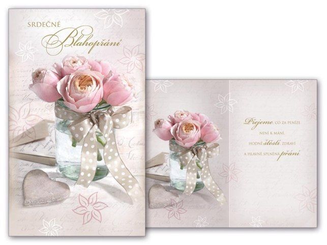 Srdečné přání k narozeninám, svátku nebo jiné příležitosti - s obrázkem květin- Nezapomeňte k dárku k narozeninám koupit i pěkné přáníčko. Uděláte oslavenci určitě velkou radost.. Text na přední straně přání: Srdečné blahopřání Text uvnitř přání: Přejeme, co za peníze není k mání, hodně štěstí, zdraví a hlavně splněná přání. Papír: pohlednicový karton 240 g Přání je baleno v sáčku, součástí balení je i dopisní obálka.