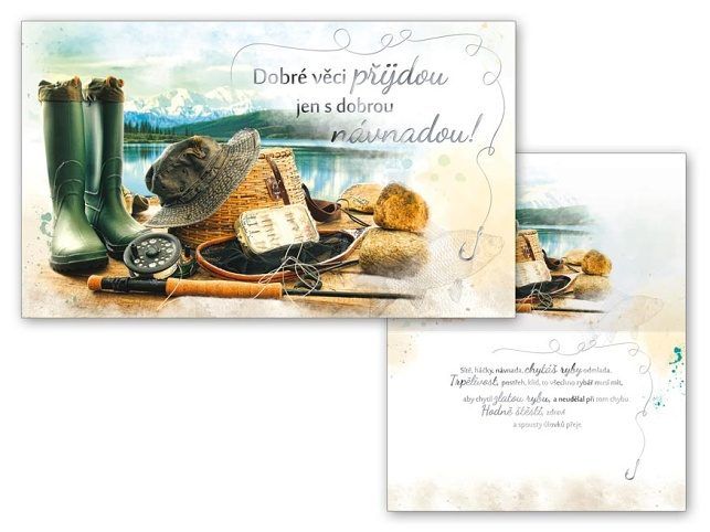 Srdečné přání k narozeninám, svátku nebo jiné příležitosti - s motivy rybaření - vhodný pro rybáře - Nezapomeňte k dárku k narozeninám koupit i pěkné přáníčko. Uděláte oslavenci určitě velkou radost. Text na přední straně přání: Dobré věci příjdou jen s dobrou návnadou! Text uvnitř přání: Sítě, háčky, návnada, chytáš ryby odmlada. Trpělivost, postřeh, klid, to všechno rybář musí mít, aby chytil zlatou rybu, a neudělal při tom chybu. Hodně štěstí, zdraví a spousty úlovků přeje Papír: pohlednicový karton 240 g Přání je baleno v sáčku, součástí balení je i dopisní obálka