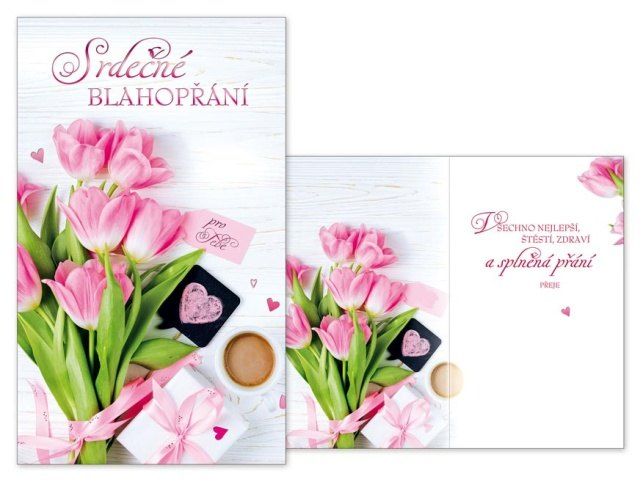 Přání k narozeninám s textem a obrázkem kytice tulipánů. Nezapomeňte k dárku k narozeninám koupit i pěkné přáníčko. Určitě uděláte oslavenci velkou radost. Text na přední straně přání: Srdečné blahopřání Text uvnitř přání: Všechno nejlepší, štěstí, zdraví a splněná přání přeje Papír: pohlednicový karton 240 g Přání je baleno v sáčku, součástí balení je i dopisní obálka