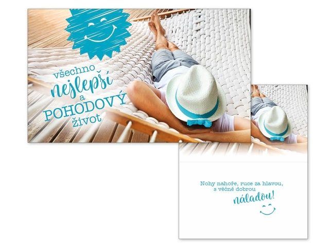 Srdečné přání k narozeninám s textem - Nezapomeňte k dárku k narozeninám koupit i pěkné přáníčko. Uděláte oslavenci určitě velkou radost. Text na přední straně přání: Všechno nejlepší a pohodový život Text uvnitř přání: Nohy nahoře, ruce za hlavou, s věčně dobrou náladou! Přání je s obrázkem muže na houpací síti.
