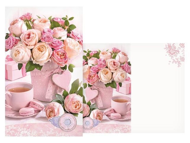 Srdečné přání s kyticí růží. Text na přední straně přání: Bez textu. Text uvnitř přání: Bez textu Papír: pohlednicový karton 240 g Přání je baleno v sáčku, součástí balení je i dopisní obálka.