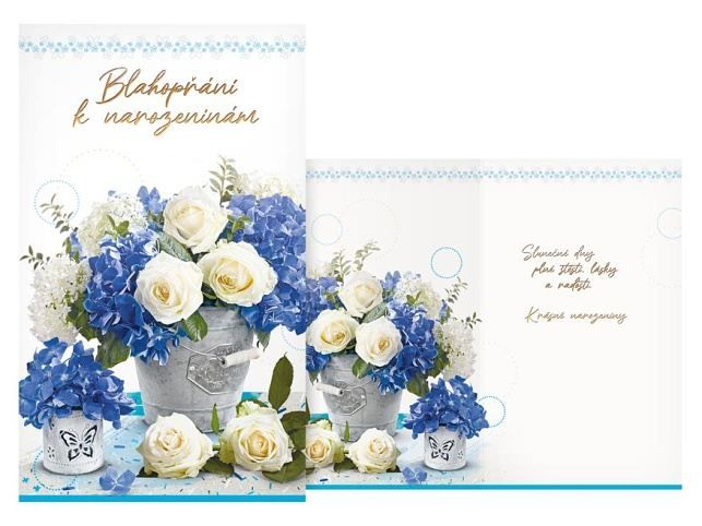 Přání srdečné. Udělejte oslavenci radost originálním narozeninovým přáním. Text na přední straně přání: Blahopřání k narozeninám Text uvnitř přání: Slunečné dny plné štěstí, lásky a radosti. Krásné narozeniny Papír: pohlednicový karton 240 g Přání je baleno v sáčku, součástí balení je i dopisní obálka. Uvedená cena jeza 1 ks.