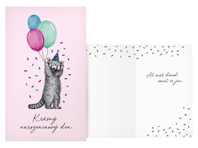 Přání srdečné k narozeninám. Přání je s motivem medvídka mývala a narozeninových balonků. Oslavy narozenin patří k výjimečným a příjemným okamžikům v životě. Potěšte oslavence a spolu s dárkem mu věnujte originální a krásné přáníčko, které mu bude připomínat tuto radostnou událost. Text na přední straně: Krásný narozeninový den Text uvnitř přání: Ať máš důvod smát se jen. Papír: pohlednicový karton Přání je baleno v sáčku, součástí balení je i dopisní obálka. Uvedená cena je za 1 ks.
