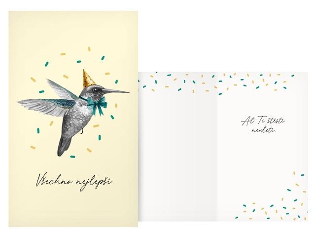 Přání srdečné k narozeninám. Přání je s motivem kolibříka. Oslavy narozenin patří k výjimečným a příjemným okamžikům v životě. Potěšte oslavence a spolu s dárkem mu věnujte originální a krásné přáníčko, které mu bude připomínat tuto radostnou událost. Text na přední straně: Všechno nejlepší Text uvnitř přání: Ať Ti štěstí neuletí. Papír: pohlednicový karton Přání je baleno v sáčku, součástí balení je i dopisní obálka. Uvedená cena je za 1 ks.
