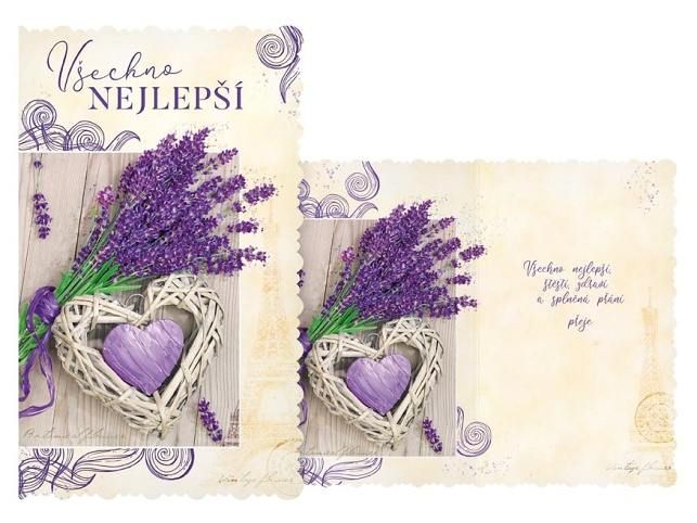 Srdečné přání je krásným způsobem, jak popřát k jakékoliv významné události s elegancí a osobním nádechem. Motiv levandule a proutěného srdce dodává přání jemnost a romantický styl, který osloví každého. Toto přání je ideální volbou pro narozeniny, svátky nebo jiné oslavy, kdy chcete udělat radost a podělit se o upřímné přání. Text na přední straně: Všechno nejlepší Text uvnitř přání: Všechno nejlepší, štěstí, zdraví a splněná přání přeje Papír: pohlednicový karton Přání je baleno v sáčku, součástí balení je i dopisní obálka. Uvedená cena je za 1 ks.