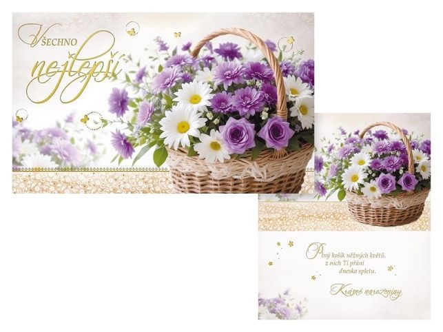 Krásné srdečné přání je ideálním způsobem, jak popřát k narozeninám nebo jiné významné události. Květinový košík s kopretinami, fialovými růžemi a dalšími květinami dodává přání romantický a slavnostní vzhled, který zaručeně potěší obdarovaného. Text na přední straně: Všechno nejlepší Text uvnitř přání: Plný košík něžných květů, z nich Ti přání dneska spletu. Papír: pohlednicový karton Přání je baleno v sáčku, součástí balení je i dopisní obálka. Uvedená cena je za 1 ks.
