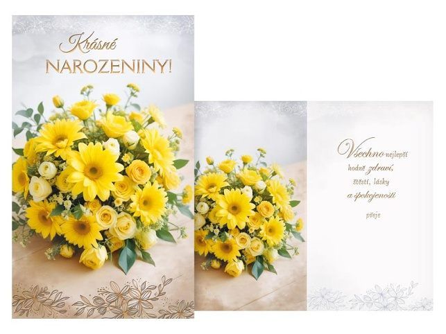 Chtěli byste popřát a zároveň vykouzlit úsměv, který vydrží celý den? S tímto nádherným přáním máte jistotu, že oslava začne ještě dřív, než se rozbalí první dárek! Žluté květy na obálce září jako slunce a doslova volají po radosti, zatímco zlatý nápis „Krásné narozeniny!“ přidává kapku elegance. Udělejte z narozenin nezapomenutelný moment plný radosti, úsměvů a tepla – protože takové chvíle stojí za to oslavit! Text na přední straně: Krásné narozeniny Text uvnitř přání: Všechno nejlepší, hodně zdraví , těstí, lásky a spokojenosti přeje Papír: pohlednicový karton Přání je baleno v sáčku, součástí balení je i dopisní obálka. Uvedená cena je za 1 ks.