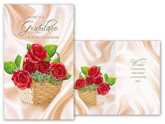 Srdečné blahopřání k narozeninám s textem. Text na přední straně přání: Srdečná gratulace k narozeninám Text uvnitř přání: Vše nejlepší k narozeninám, hodně zdraví a životní pohody přeje Papír: pohlednicový karton 240 g Přání je baleno v sáčku, součástí balení je i dopisní obálka