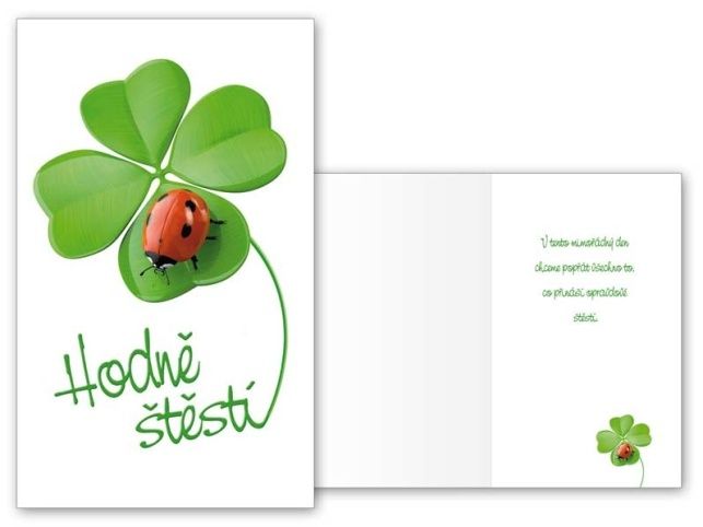 Srdečné blahopřání k narozeninám nebo svátku s obrázkem čtyřlístku a berušky. Text na přední straně přání: Hodně štěstí Text uvnitř přání: V tento mimořádný den chceme popřát všechno to, co přináší opravdové Šestí. Papír: pohlednicový karton 240 g Přání je baleno v sáčku, součástí balení je i dopisní obálka