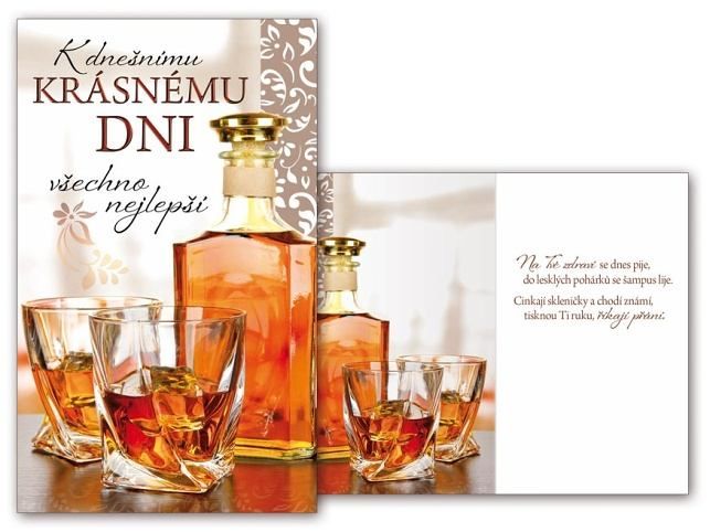 Srdečné přání malé k narozeninám s textem a obrázkem láhve whisky. Nezapomeňte k dárku k narozeninám koupit i pěkné přáníčko. Uděláte oslavenci určitě velkou radost. Text na přední straně přání: K dnešnímu krásnému dni všechno nejlepší Text uvnitř přání: Na Tvé zdraví se dnes pije, do lesklých pohárků se šampus lije. Cinkají skleničky a chodí známí, tisknou ti ruku, říkají přání. Uvedená cena je za 1 ks. Přání je baleno v sáčku, součástí balení je i dopisní obálka.