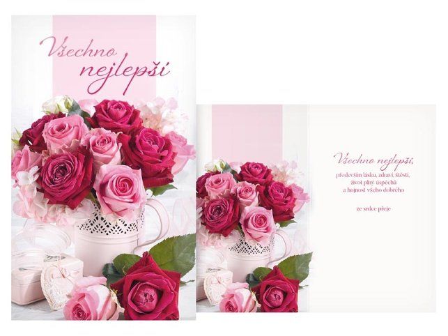 Přání srdečné malé. Krásné přání s motivem květů růže, které udělá určitě velkou radost. Oslavy narozenin patří k výjimečným a příjemným okamžikům v životě. Potěšte oslavence a spolu s dárkem mu věnujte originální a krásné přáníčko, které mu bude připomínat tuto radostnou událost. Text na přední straně: Všechno nejlepší Text uvnitř přání: Všechno nejlepší, především lásku, zdraví, šestí, život plný úspěchu a hojnost všeho dobrého ze srdce přeje Papír: pohlednicový karton Přání je baleno v sáčku, součástí balení je i dopisní obálka. Uvedená cena je za 1 ks.