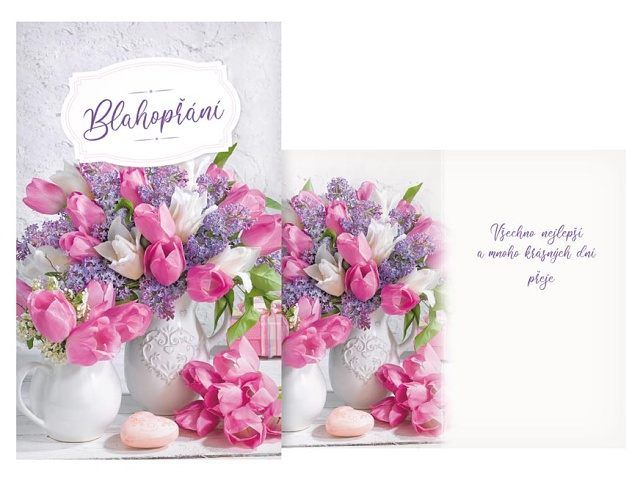 Přání srdečné malé. Krásné přání s motivem květů tulipánů a šeříku udělá určitě velkou radost. Oslavy narozenin patří k výjimečným a příjemným okamžikům v životě. Potěšte oslavence a spolu s dárkem mu věnujte originální a krásné přáníčko, které mu bude připomínat tuto radostnou událost. Text na přední straně: Blahopřání Text uvnitř přání: Všechno nejlepší a mnoho krásných dní přeje Papír: pohlednicový karton Přání je baleno v sáčku, součástí balení je i dopisní obálka. Uvedená cena je za 1 ks.