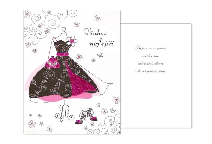 Srdečné přání k narozeninám, svátku nebo jiné příležitosti. Text na přední straně přání: Všechno nejlepší Text uvnitř přání: Přejeme, co za peníze není k mání, hodně štěstí, zdraví a hlavně splněná přání. Papír: pohlednicový karton 240 g Přání je baleno v sáčku, součástí balení je i dopisní obálka