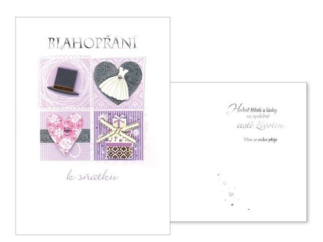 Svatební přání s textem. Mezi svatebními dary by nikdy nemělo chybět i přání novomanželům. Text na přední straně přání: Blahopřání k sňatku Text uvnitř přání: Hodně štěstí a lásky na společné cestě životem Vám ze srdce přeje papír: pohlednicový karton 240 g Přání je baleno v sáčku, součástí balení je i dopisní obálka