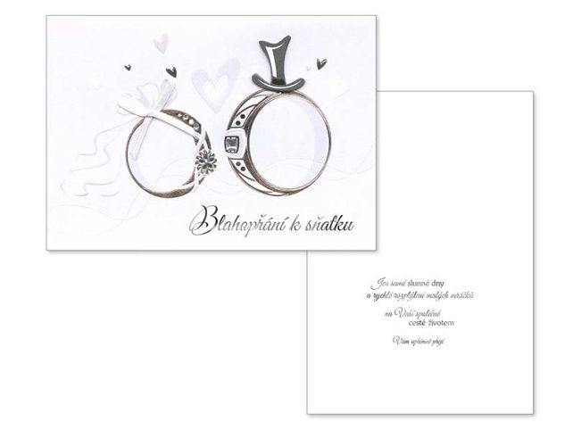 Svatební přání s textem - Svatba je příjemná a mimořádná událost a je začátkem nové etapy života. Mezi svatebními dary by nikdy nemělo chybět i přání novomanželům. Udělejte radost novomanželům a věnujte jim přání k jejich svazku, díky kterému si vždy připomenou krásné začátky jejich manželství. Nápis je vyrytý stříbrným písmem a na přání jsou stříbrné svatební prstýnky s mašličkou. Text na přední straně přání: Blahopřání k sňatku Text uvnitř přání: Jen samé slunné dny a rychlé rozptýlení malých mráčků na Vaší společné cestě životem Vám upřímně přejí Papír: pohlednicový karton 240 g Uvedená cena je za 1 ks. Přání je baleno v sáčku. Součástí přání je i obálka.