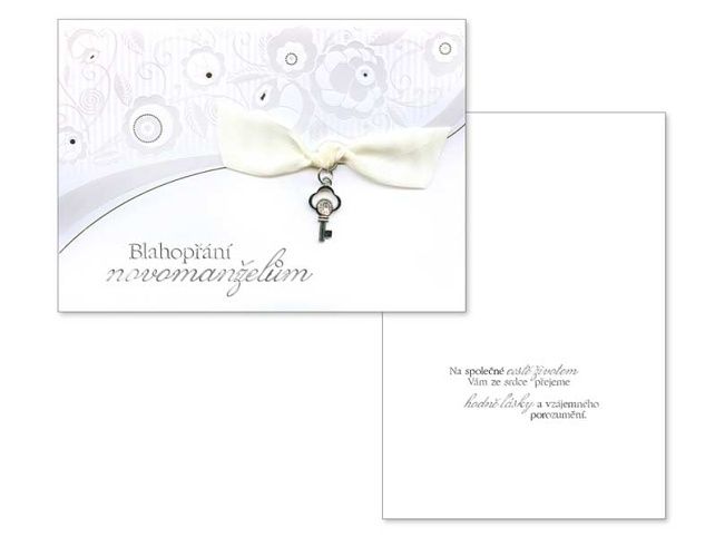 Svatební přání s textem - Svatba je příjemná a mimořádná událost a je začátkem nové etapy života. Mezi svatebními dary by nikdy nemělo chybět i přání novomanželům. Udělejte radost novomanželům a věnujte jim přání k jejich svazku, díky kterému si vždy připomenou krásné začátky jejich manželství. Nápis je vyrytý stříbrným písmem a na přání je mašlička s klíčkem. Text na přední straně přání: Blahopřání novomanželům Text uvnitř přání: Na společné cestě životem Vám ze srdce přejeme hodně lásky a vzájemného porozumění. papír: pohlednicový karton 240 g Uvedená cena je za 1 ks. Přání je baleno v sáčku. Součástí přání je i obálka.