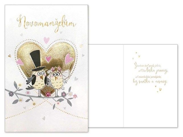 Svatební přání s textem - Svatba je příjemná a mimořádná událost a je začátkem nové etapy života. Mezi svatebními dary by nikdy nemělo chybět i přání novomanželům. Udělejte radost novomanželům a věnujte jim přání k jejich svazku, díky kterému si vždy připomenou krásné začátky jejich manželství. Nápis je vyrytý zlatým písmem a na přání jsou zamilovaní ptáčci. Text na přední straně přání: Novomanželům Text uvnitř přání: Životem teď spolu jdete, ať Vás láska provází, ať manželství prožijete, bez smutku a nesnází. Papír: pohlednicový karton 240 g Uvedená cena je za 1 ks. Přání je baleno v sáčku. Součástí přání je i obálka.
